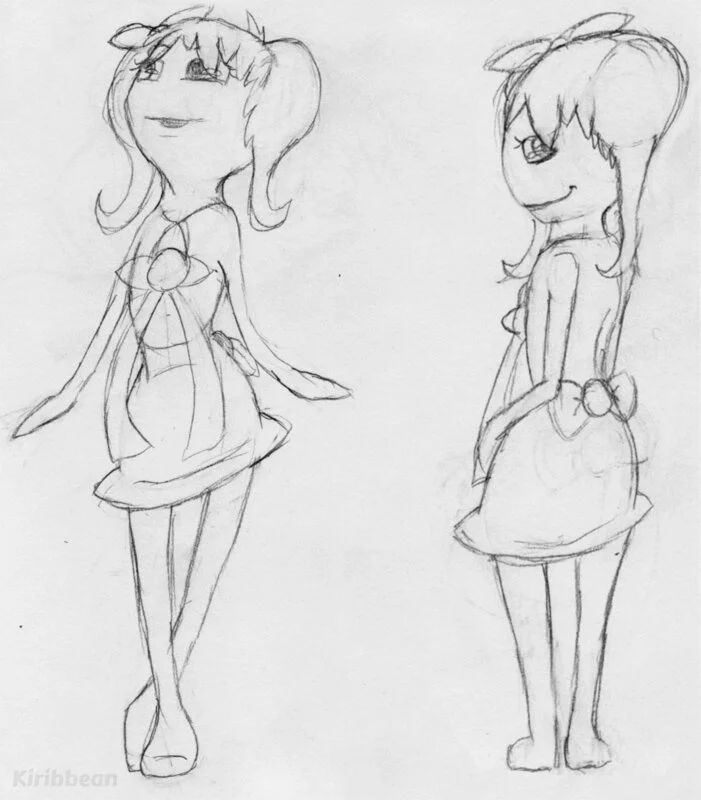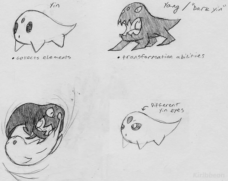 Early sketches for a hypothetical game character akin to Kirby. "Yin" would collect elemental energy to power transformations for "Yang."